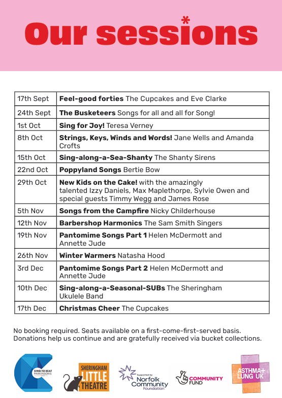 Tuesdays (EXCEPT THE 2ND OF THE MONTH), 10:30am-12 noon at The Sacred Hearts Catholic Church Hall in North Walsham, NR28 9JP. The first half an hour allows for settling in and coffee/social time then we sing 11-12.
